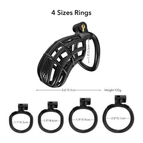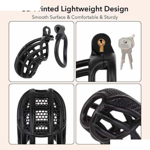 This 3D printed chastity device features an ergonomic design that naturally follows the curve of the penis. Advanced 3D printing technology makes it lightweight with a very smooth surface, ensuring a comfortable feel and a perfect fit for long-term wear. It comes with two types of locks for flexible use. The upgraded hidden lock is strong and durable, allowing you to give the key to your partner for added control and excitement. In addition, three disposable coding locks are included, which are ideal for security checks or travel. The hollow-out design provides excellent breathability, allowing proper airflow to keep the area comfortable and fresh. The front tip includes a urination hole, so normal and safe urination is possible even while wearing the cage. The set includes 4 different cuff ring sizes with diameters of 1.7 inch (4.3 cm), 1.8 inch (4.6 cm), 1.9 inch (4.9 cm), and 2 inch (5.1 cm), ensuring a suitable and secure fit for most users. It is ideal for both beginners and experienced users who want maximum comfort and reliability.